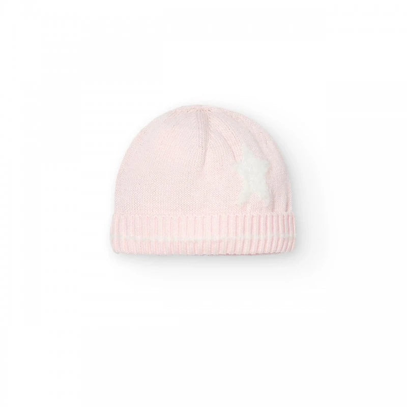 Knitted pink romper with a round neckline and long sleeves and buttons for easy dressing. It also comes with a hat with the same design by the Boboli brand.