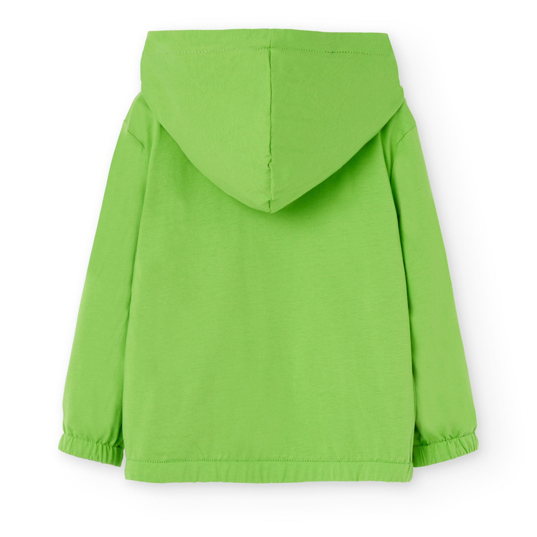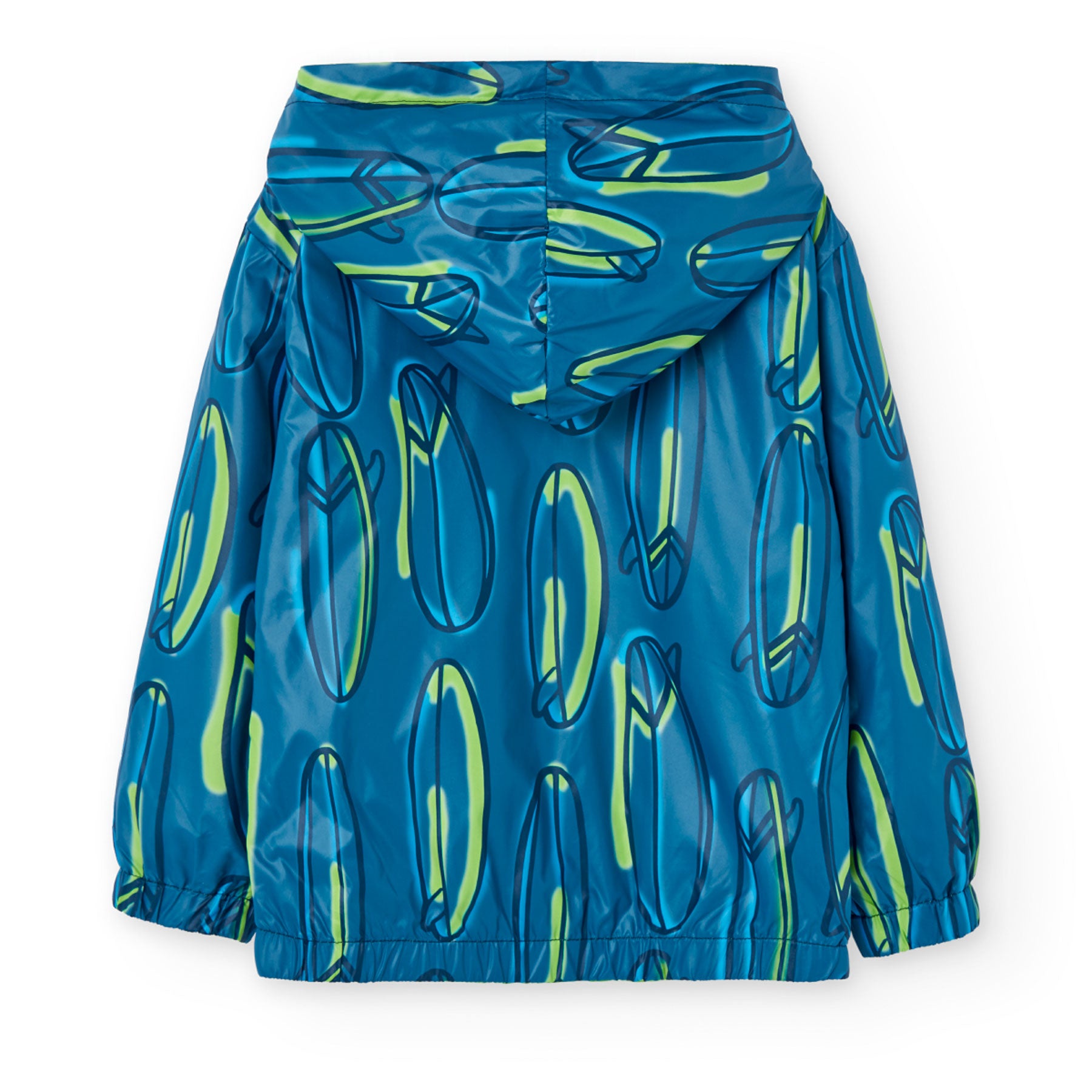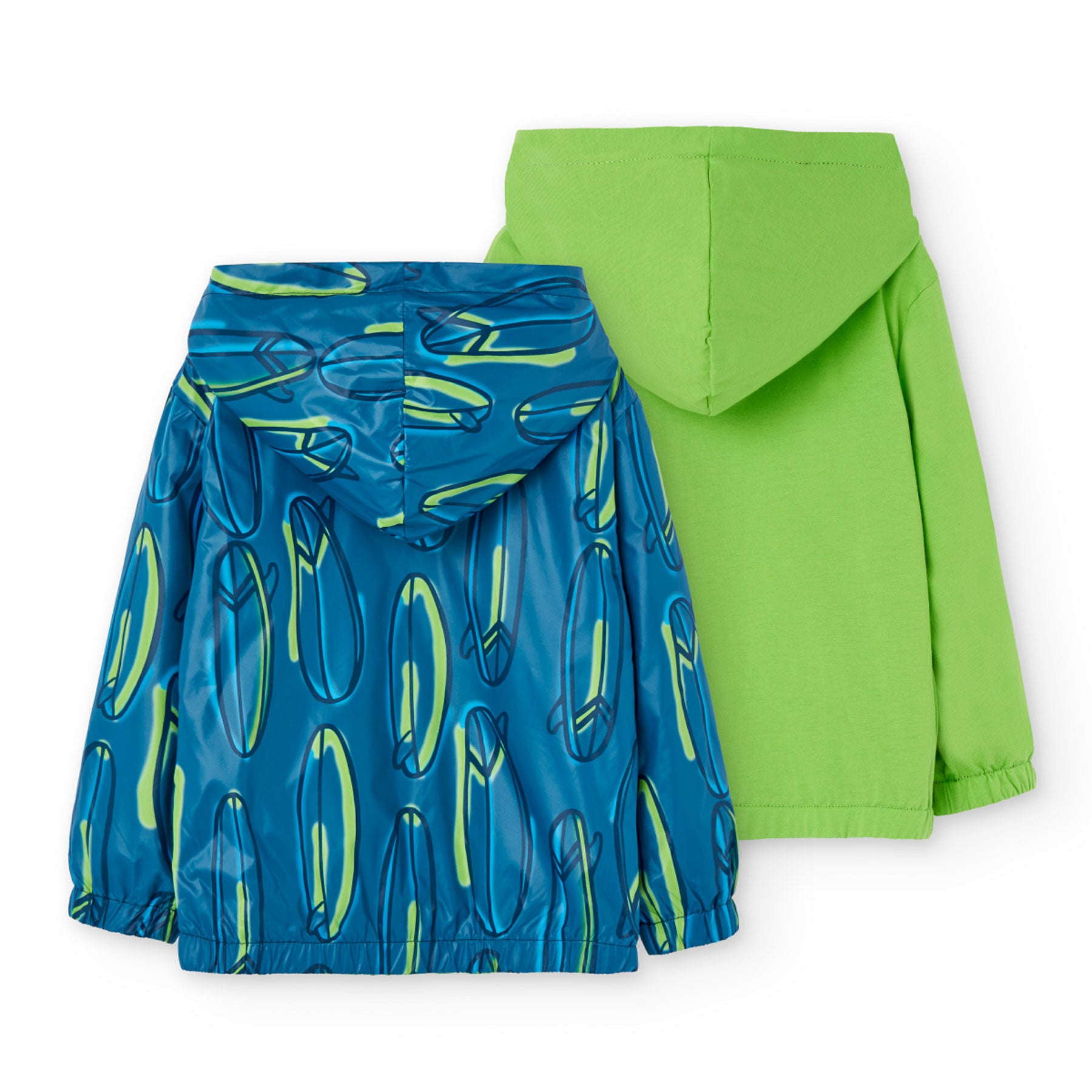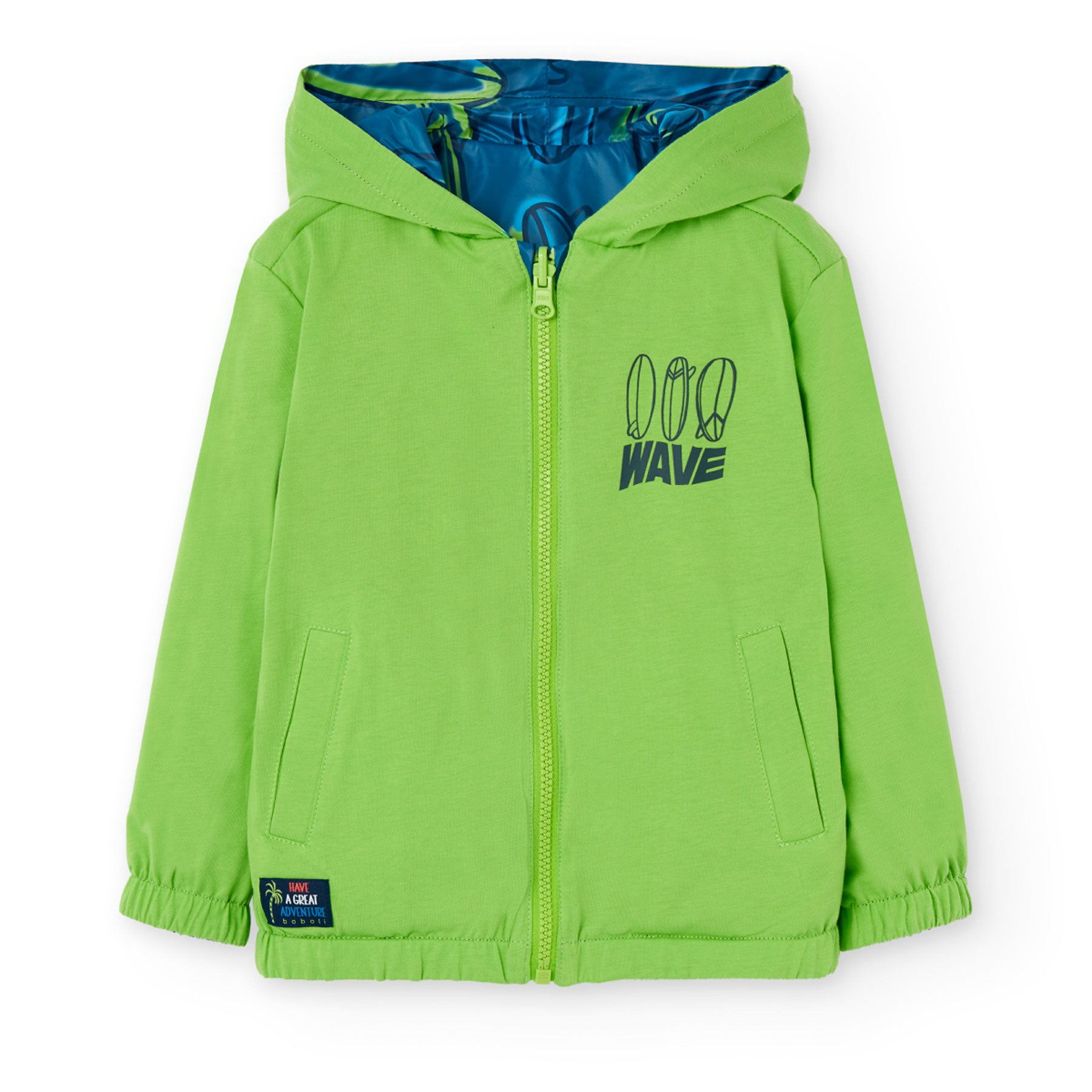 Practical children's jacket with two faces with different designs. On one side it is printed, and on the other side it is solid color. The children's jacket has long sleeves, a hood, a front zipper and elastic at the wrists. The material of the children's jacket is comfortable and high quality.