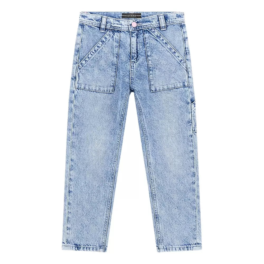 Kids' Guess jeans The model is long with an elastic waist. It has functional pockets. It fastens with a button in the front. It narrows at the end of the leg. The material is soft and comfortable.