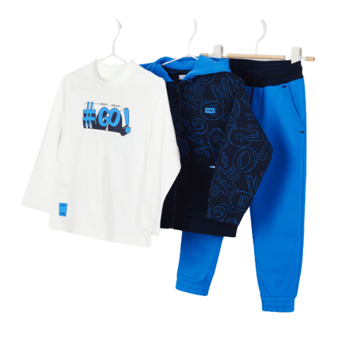 The sports set for boys is the perfect choice for a stylish and comfortable look for your boy. Made of high-quality fabrics, this set from MAYORAL is comfortable and practical for everyday wear. The set is three-piece and consists of a sweatshirt, a blouse and sports pants.