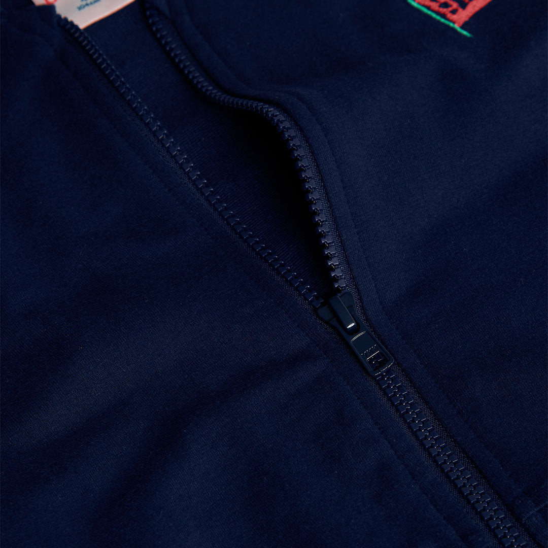 A navy blue top for girls, perfect for the fall and winter season, offering warmth and comfort with its soft fabric. It features a hood and long sleeves, perfect for keeping out the cold on cooler days. Flag embroidery stands out on the chest, adding a modern and distinctive touch to the design.