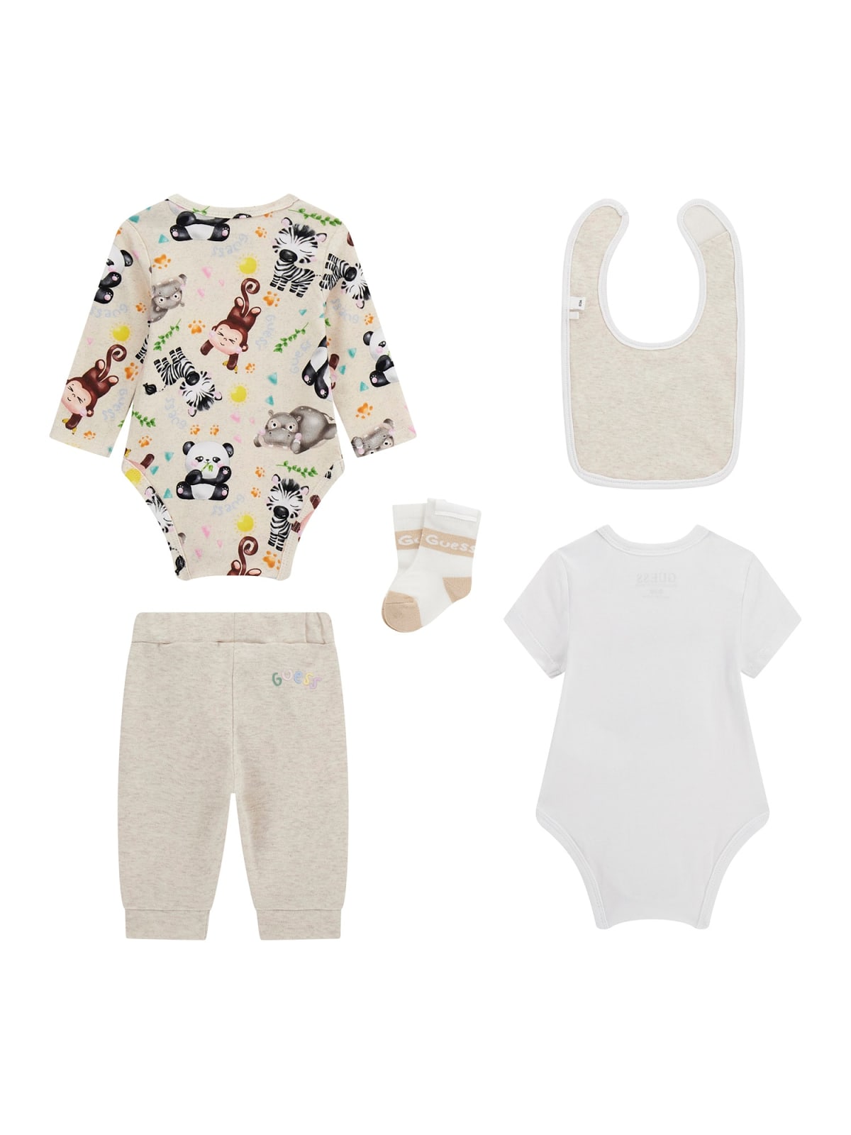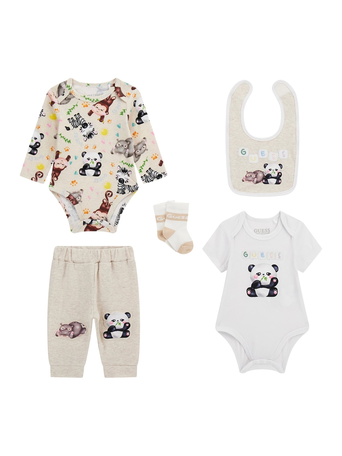 Бебешкият комплект се състои от две бодита, панталон, чорапи и лигавник. Едното боди от комплекта е с обло бие, дълъг ръкав, закопчаване с тик-так копчета в долната част и принт. Второто боди е с къс ръкав, обло бие, закопчаване с тик-так копчета в долната част, принт на панда и лого отпред. Панталона от бебешкия комплект е с ластична талия, ластичен кант на глезените и принт на носорог и панда на крачолите. Чорапите от комплекта са с ластик в горната част и лого. Лигавника от бебешкия комплект е с принт на носорог и панда и лого. Бебешкият комплект е изработен от качествена памучна материя.