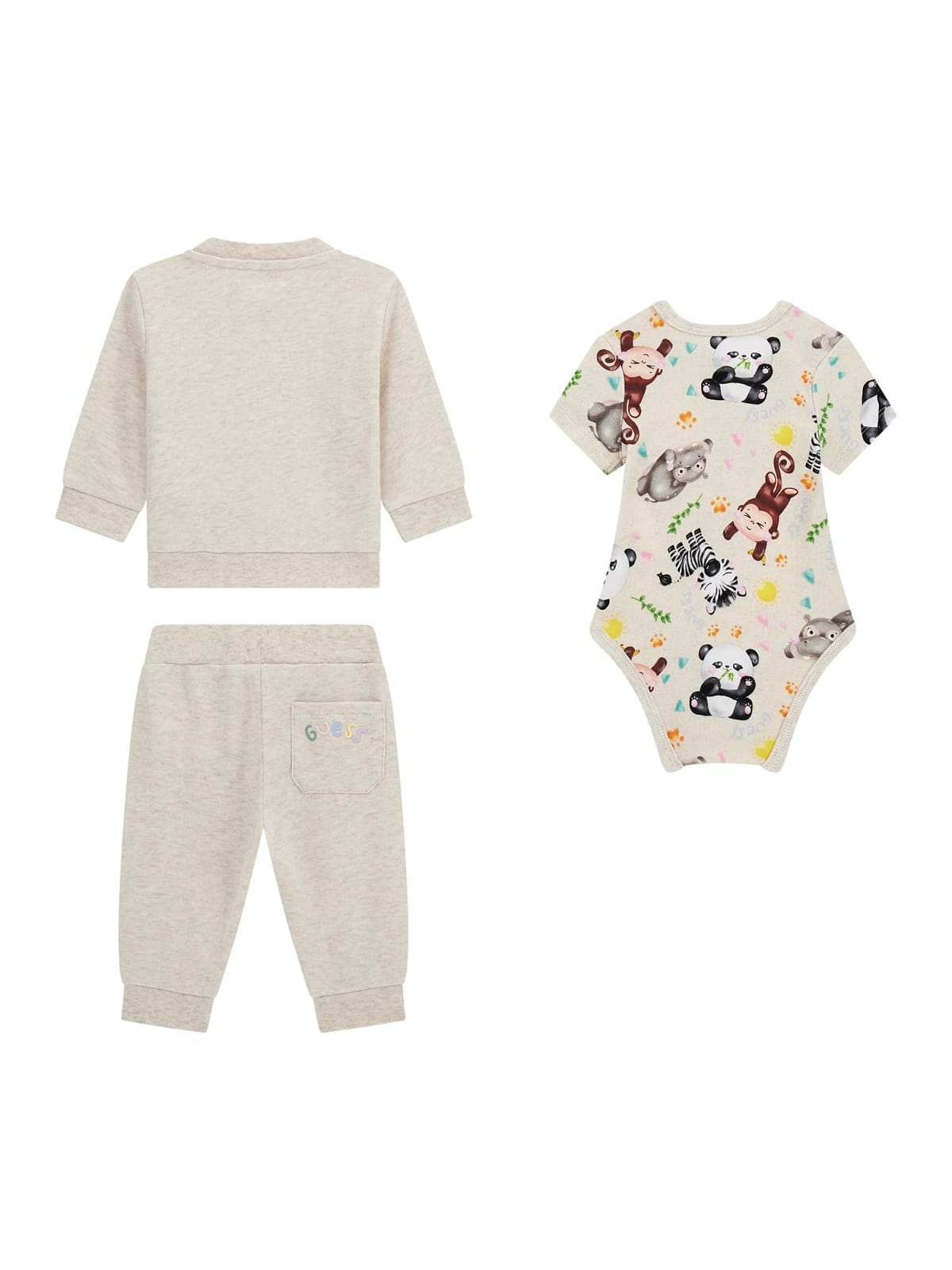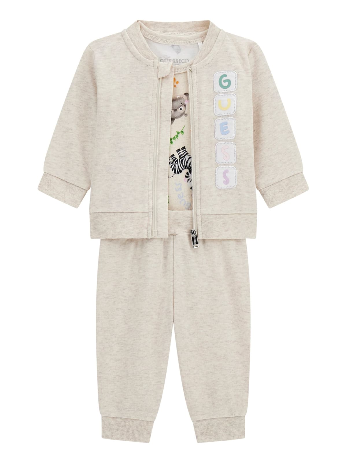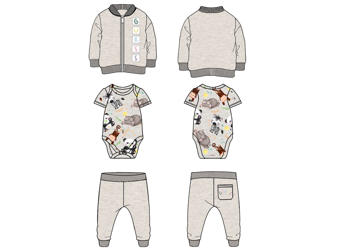 Бебешкият комплект се състои от три части. Суитшърта е с обло бие, цип, дълъг ръкав, ластичен кант на китките и кръста и лого отпред. Бодито от бебешкия комплект е с обло бие, къс ръкав, закопчаване с тик-так копчета в долната част и принт. Панталона от комплекта е с ластична талия и ластичен кант на глезените. Бебешкият комплект е изработен от качествена и комфортна материя.
