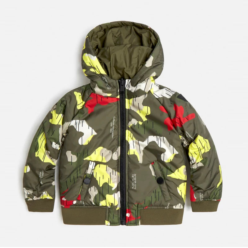 Двулицево яке за момче в зелено Guess. Страхотен дизайн. От едната страна е в шарен камуфлаж, а от другата страна е едноцветно. Закопчава се с цип, има несваляема качулка. Ластици в края на ръкавите и в долната част на якето. Един от топ моделите за сезона. Джобове с копчета.
