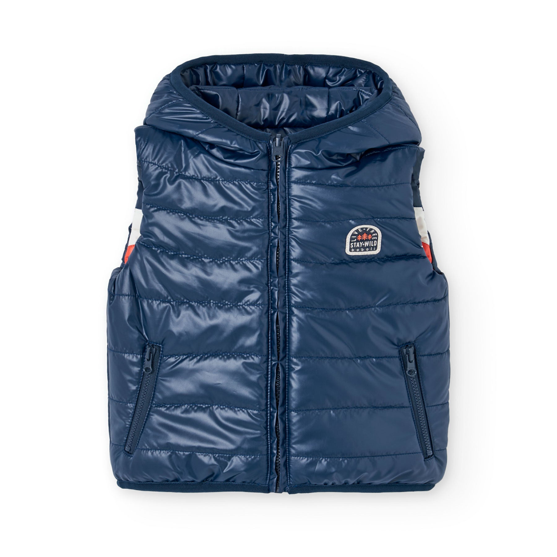 Двулицев елек от двустранна техническа материя, идеална за деца, перфектна за есенния и зимния сезон. Дизайнът е с цветни блокове: тъмносиньо от едната страна и червено и маслиненозелено от другата, което осигурява гъвкавост и стил. Изработен от водоустойчив материал, той предлага топлина и защита от студа.