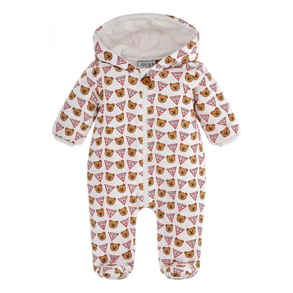 Бебешки трикотажен космонавт Guess. Топъл космонавт за най-студените зимни дни, който ще обгърне бебечето ти в топла прегръдка. Космонавтът е с качулка и ластинчи ленти около китките.
