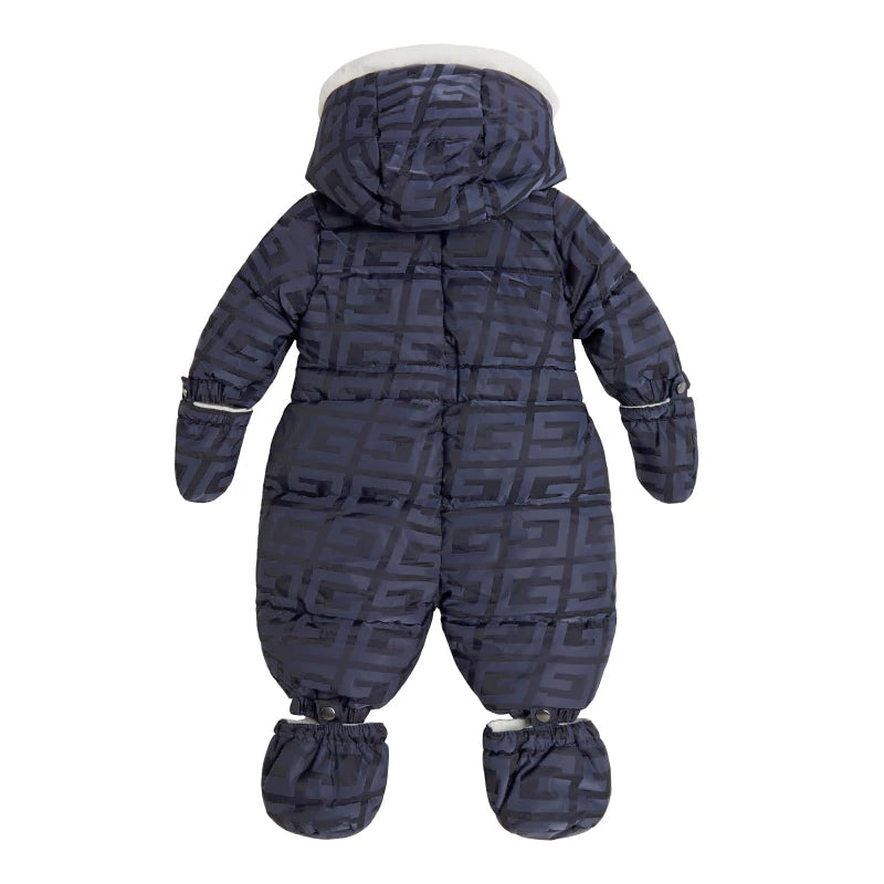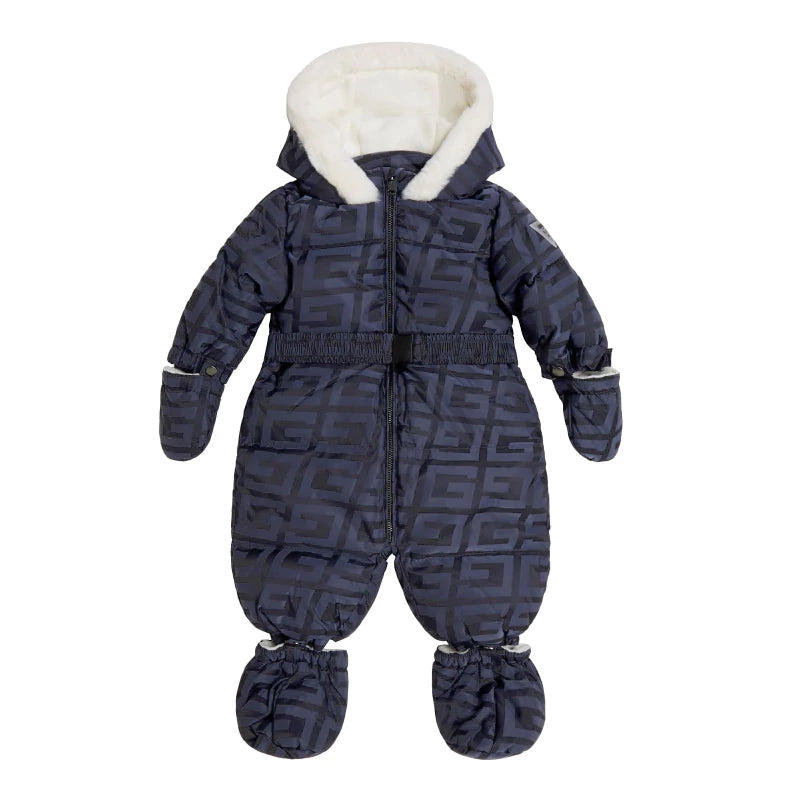 Зимен ескимос за бебе в тъмно синьо покрит с надписи Guess. Страхотен дизайн с колан на Талията, за пристягане. Ръкавички и пантофки, които се свалят. Мека, плюшена качулка. Дизайн с цип и гумено лого на марката на единия ръкав.