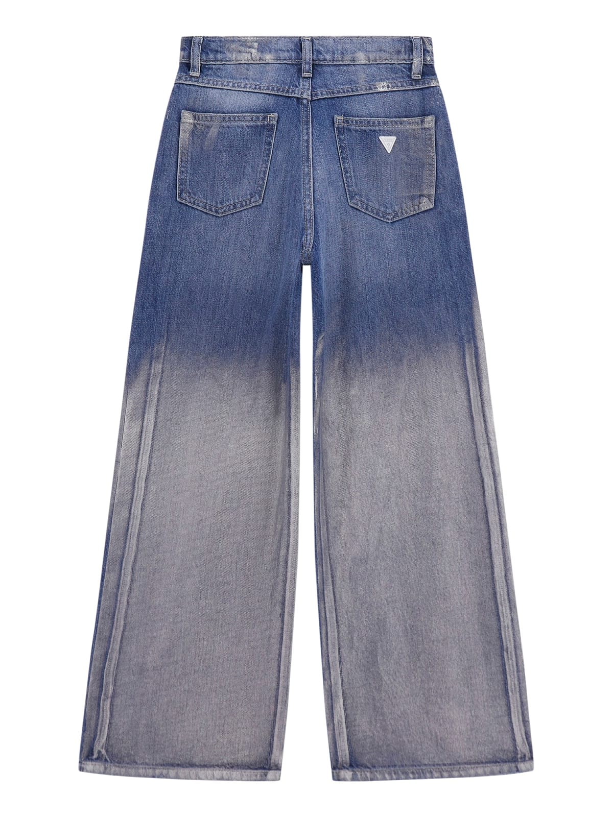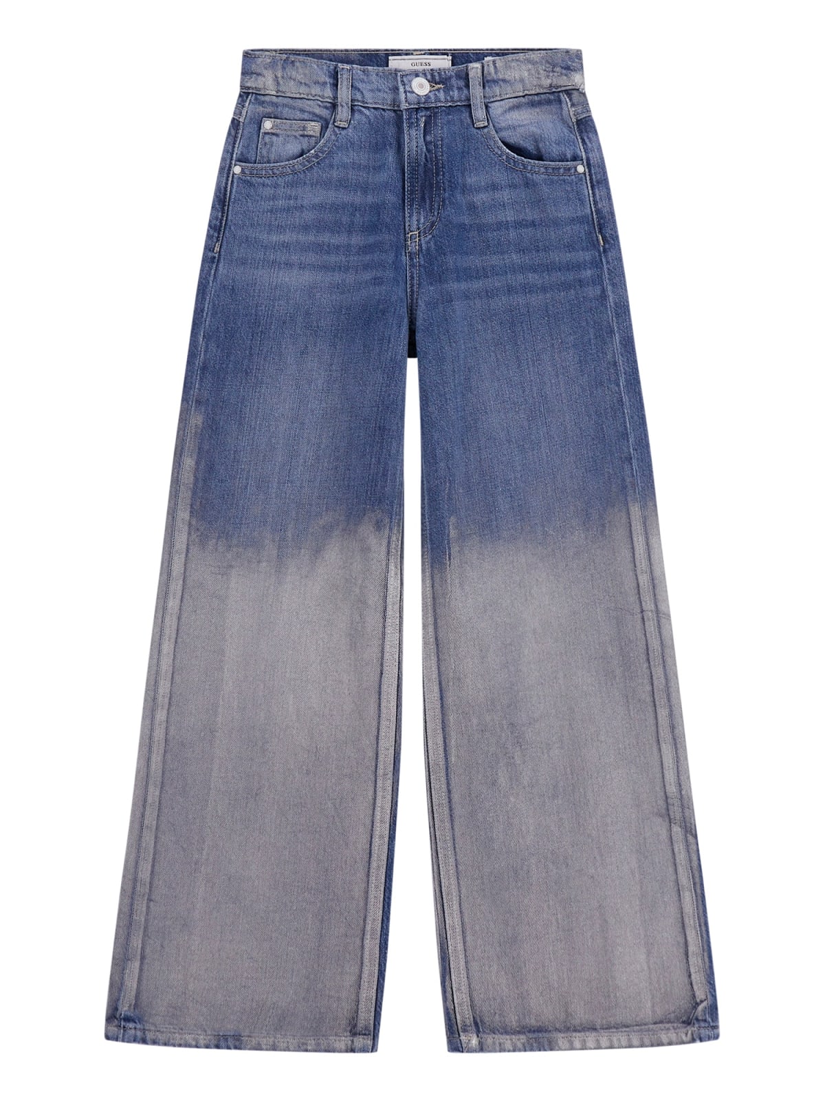 Детски дънки с изтъркан ефект Guess. Страхотен модел за една забележителна спортна визия. Дънки с висока талия и широки крачоли, фукнционални джобове в предната и задната част и акцентиращ избелен ефект тип омбре. Чудесно може да комбинирате с любима блуза, пуловер или ризка.