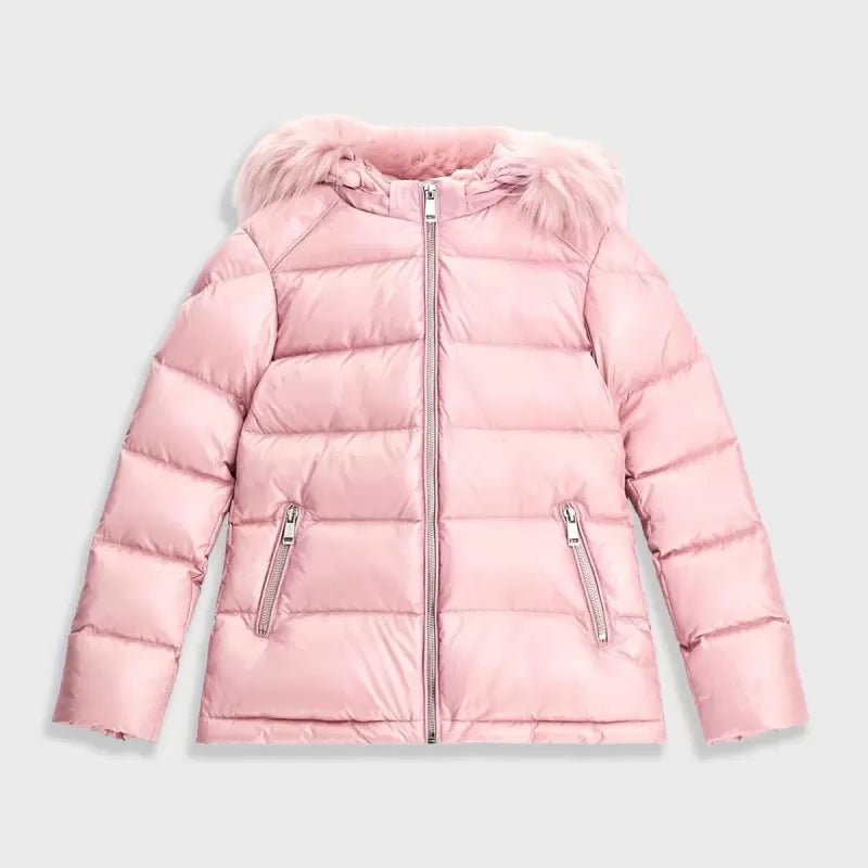 Зимно яке с пух в розово за момиче Guess. Страхотен втален дизайн. Ластици в края на ръкавите. Централно предно закопчаване с цип. Голяма качулка с пух, която може да се сваля. Джобове с ципове. Модел идеален за студените зимни дни. Пълнеж от пух. Много стилно.