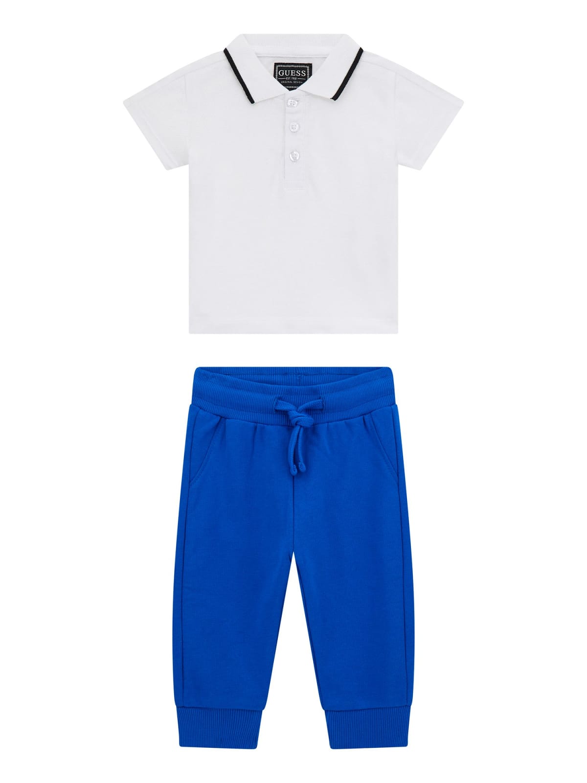 Този комплект на Guess е перфектната дреха за всяко дете, което обича стилната и удобна дреха. Памучен сет, който ще осигури необходимия комфорт на вашето бебче през ежедневието. Бяла тениска с якичка и контрастна лента, копченца на деколтето за по - лесно обличане. Комфортно долнище с еластична талия и връзки за корекция.