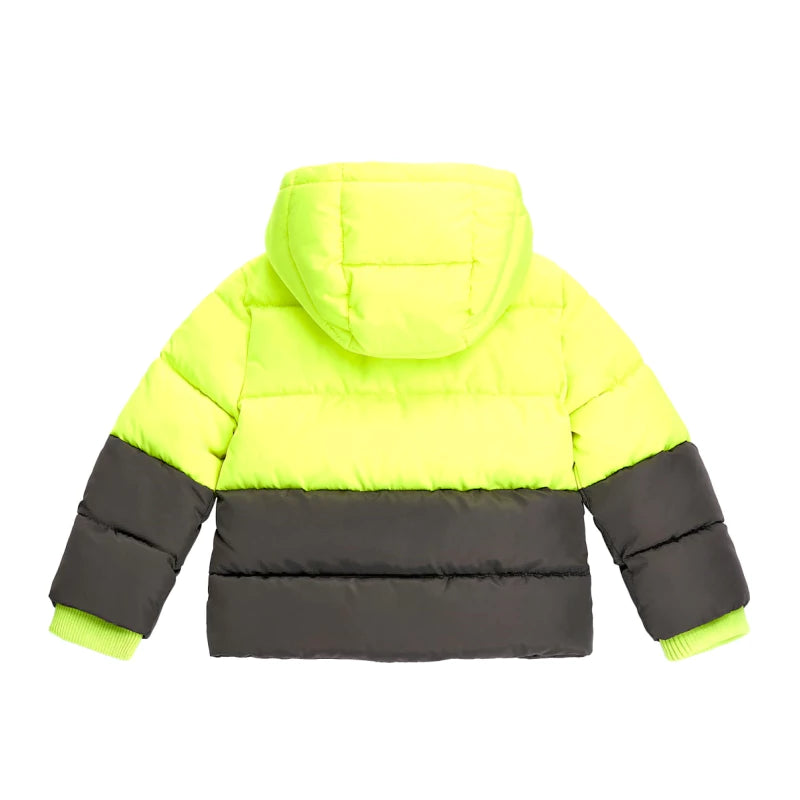 Зимно трицветно яке за момче Guess. Страхотен дизайн с качулка. Закопчаване с цип отпред и джобове с ципове. Голям контрастен надпис на марката отпред. Ластици в края на ръкавите и в долната част на якето.