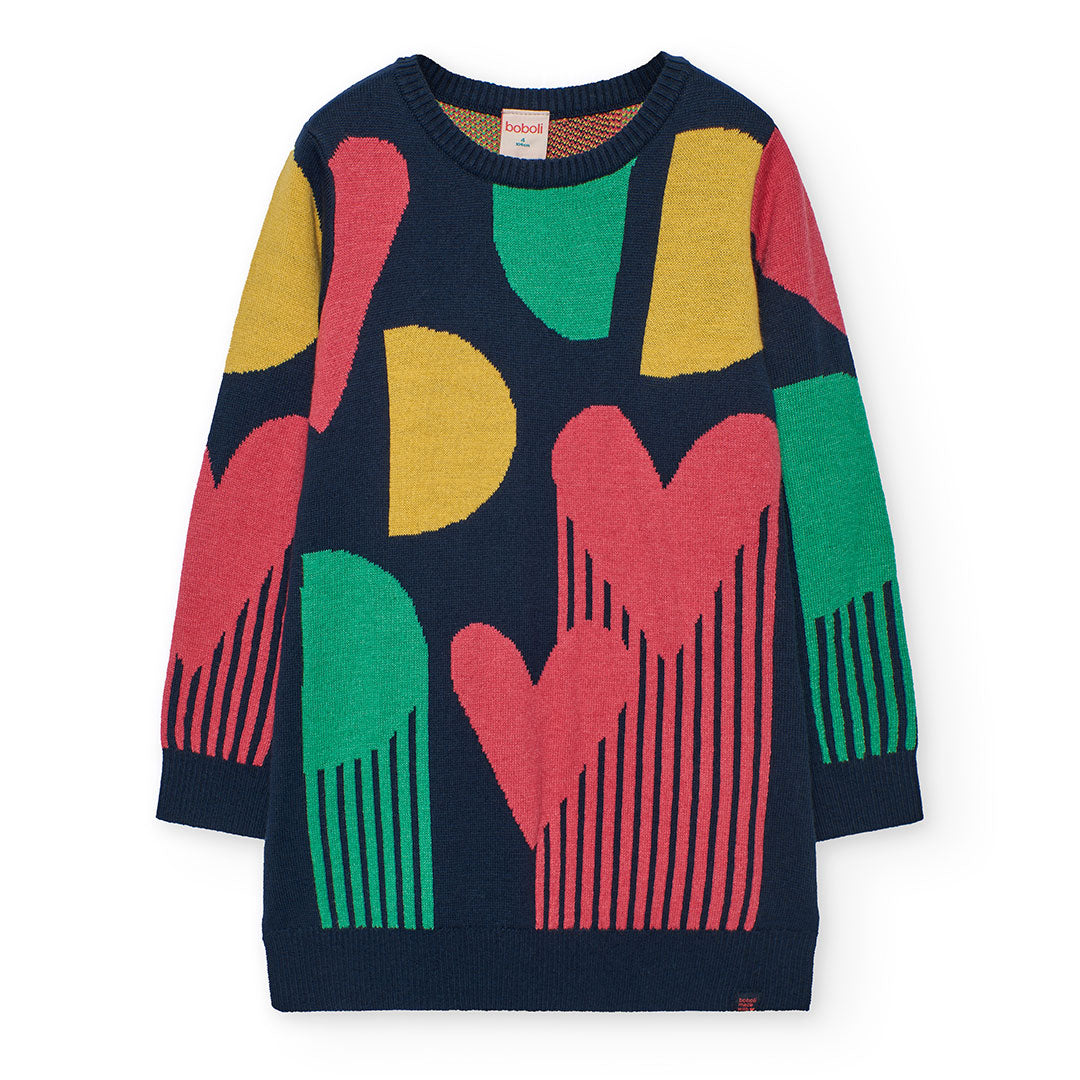 Тъмносиня рокля, идеална за есенния и зимния сезон, предлагаща топлина и стил за момичетата. Изработена от удобна материя, тя се отличава с елегантен геометричен дизайн в контрастни тонове, които ѝ придават модерен и изискан вид. Кръглото деколте и дългите ръкави осигуряват удобно прилягане в студените дни.