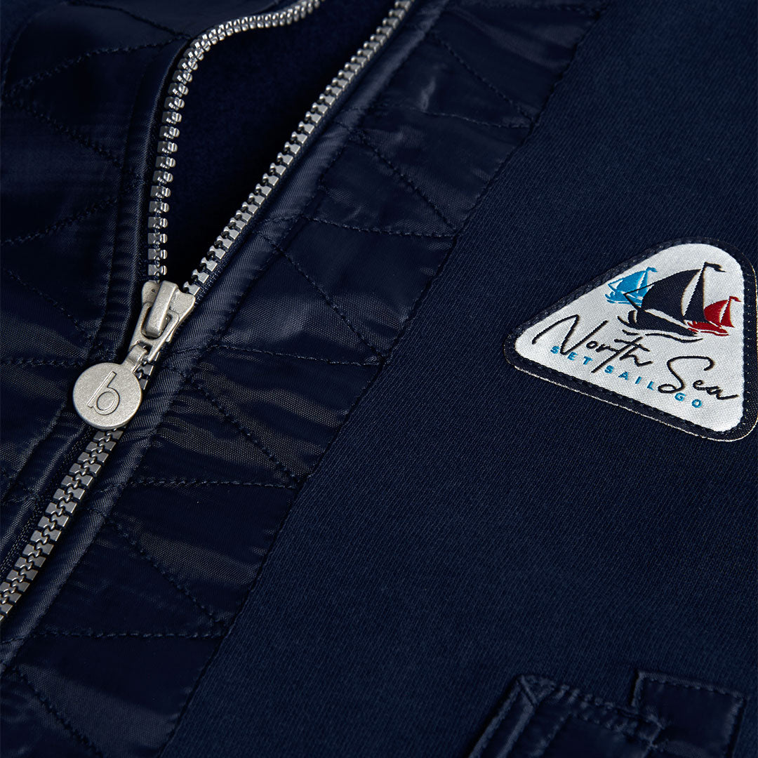 Тъмносин суичър за момчета, идеален за есенния и зимния сезон благодарение на топлата и удобна материя. Закопчава се с цип и има дълги ръкави за сигурно прилягане. Перфектен за съчетаване с дънки или ежедневни панталони, добавя класически и универсален стил към детския гардероб.