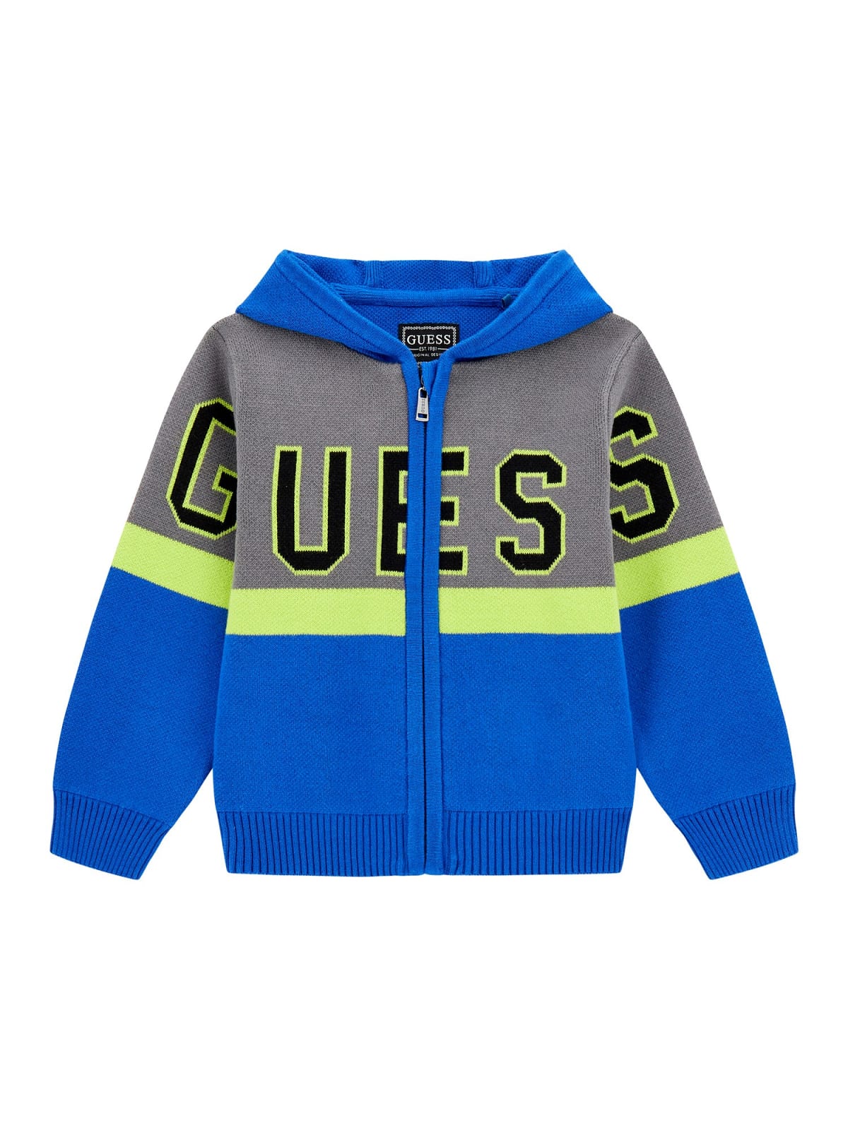 Детската жилетка е от фино плетиво, с качулка, закопчаване с цип и лого отпред. Изработен от мека памучна материя.