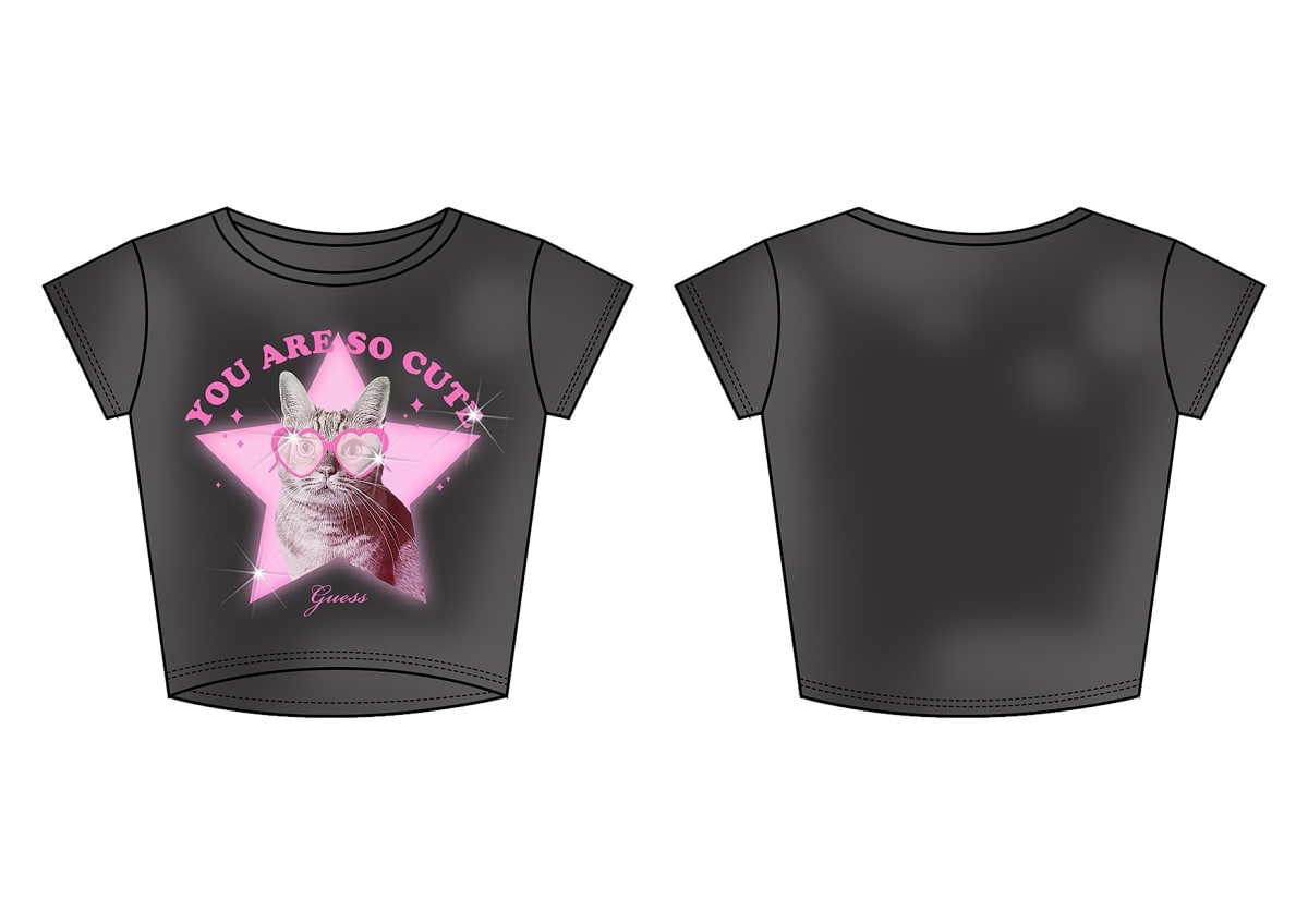 Тениска за момиче Guess. Моделът е направен от тънка и еластична материя. Изработена от много фин памук. Надписи отпред.