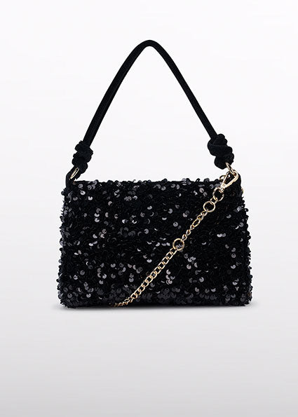 Детска пайетена чанта в черен цвят Abel and Lula. Страхотно мини бижу, изработено от луксозни черни пайети, които придават изискан блясък на всяка визия. Дизайнът е допълнен със златиста верижка и детайл с лого, съчетавайки елегантност и стил. Перфектният аксесоар за специални поводи или за добавяне на ефектен акцент към вечерния тоалет на вашата малка дама.