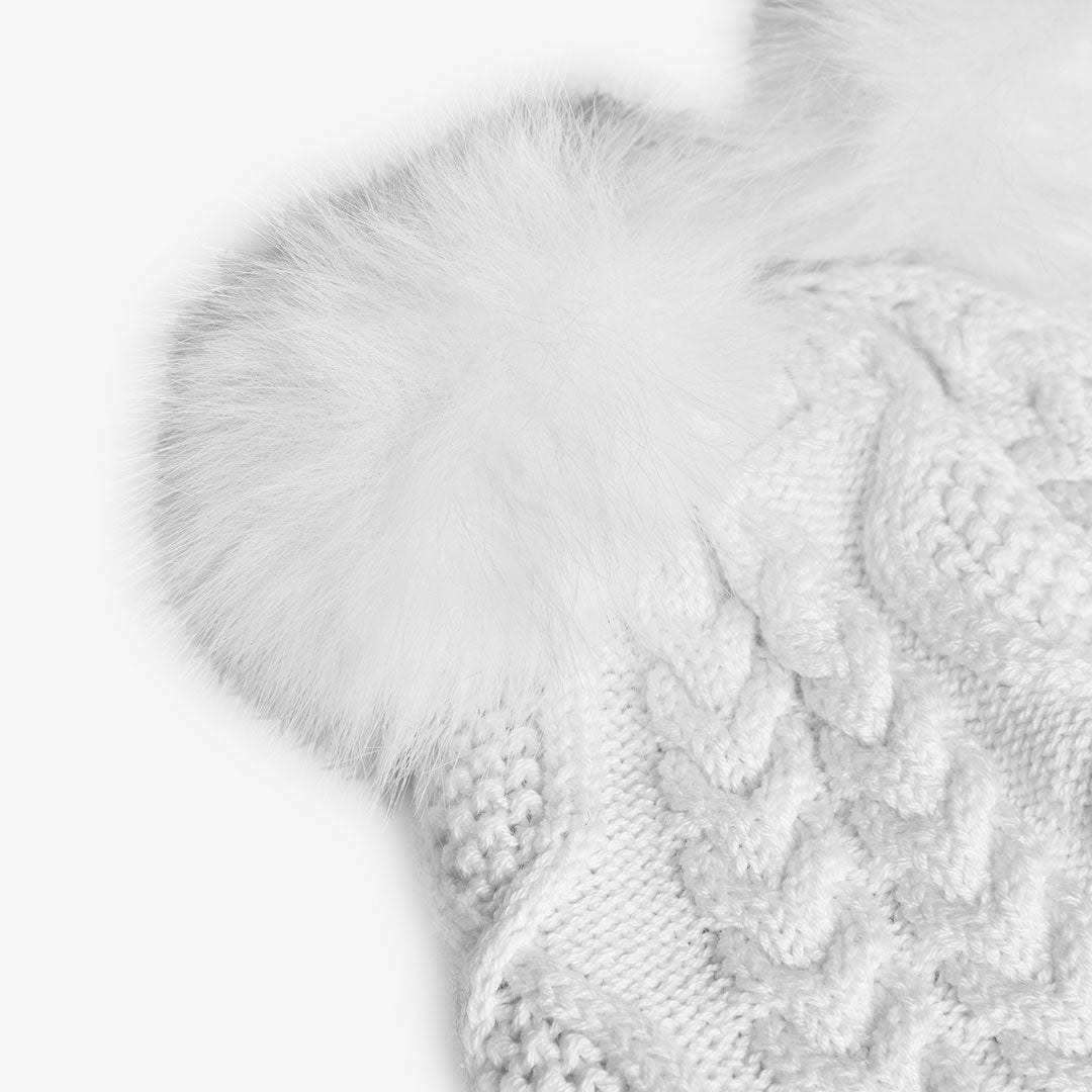 Топла зимна шапка в снежнобял цвят. Ефектна плетена текстура с фигурални мотиви. Два пухкави помпона в горната част за игрив и сладък акцент. Мека и пухкава вътрешна подплата за максимален комфорт и топлина. Кожена апликация с логото на Boboli отпред. Идеален аксесоар за студени зимни дни и стилна визия