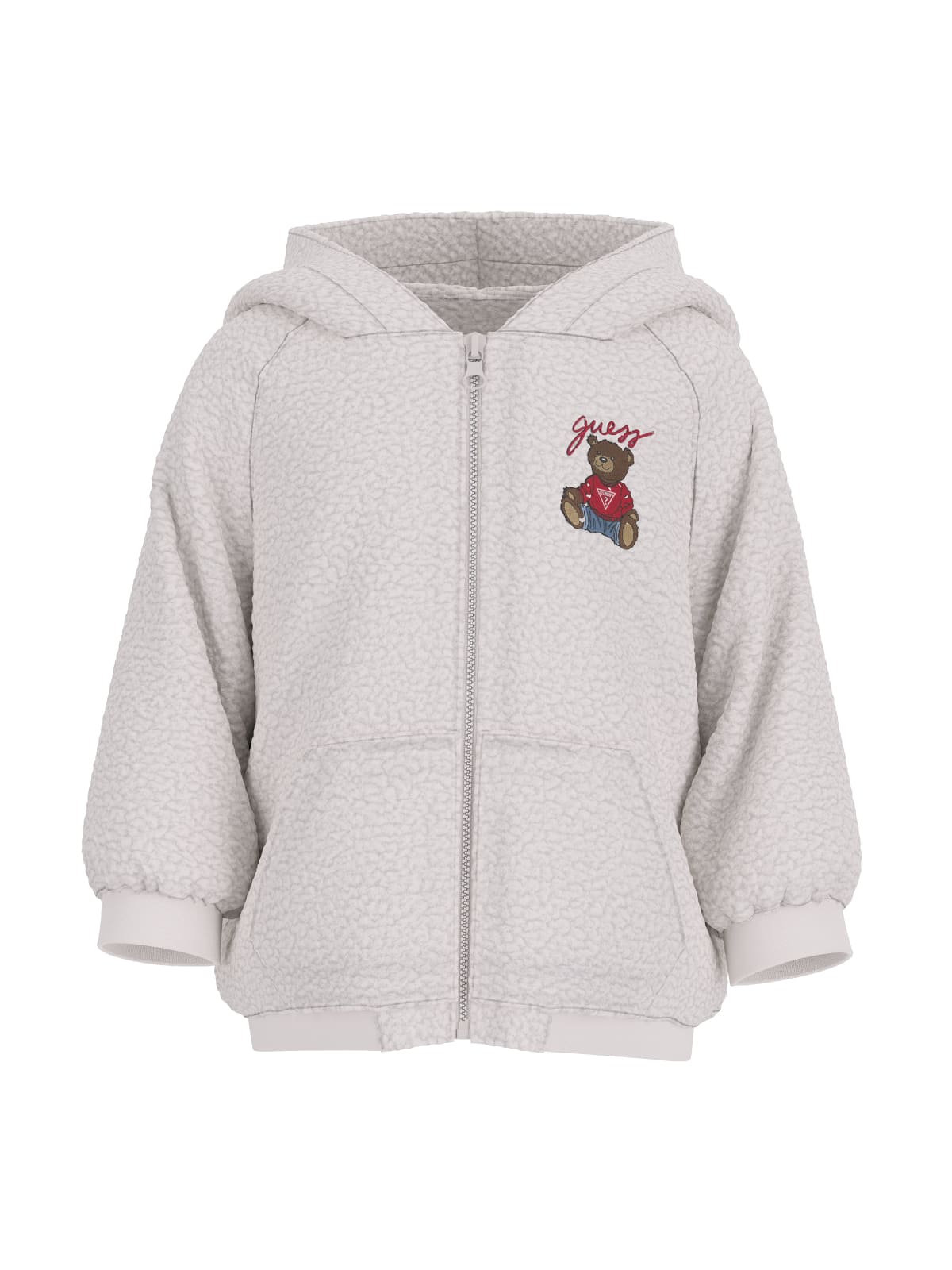 Детско якe GUESS Kids с качулка. Отличава се с удобна кройка и цип отпред, осигуряващи топлина и комфорт за най-малките. С емблематично мече за стилен завършек.
